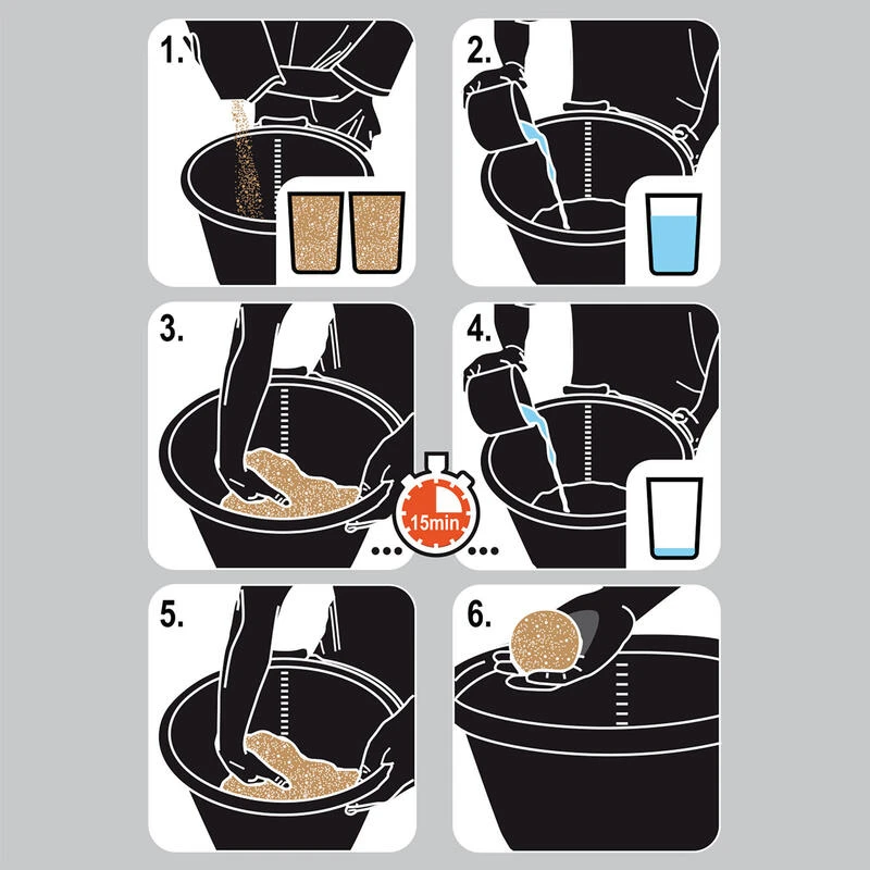 On commence tout d’abord par verser les 3/4 du volume d’eau nĂ©cessaire en mĂ©langeant Ă©nergĂ©tiquement avec la main dans un seau rond pour permettre aux particules de l’amorce de se gorger d’eau.